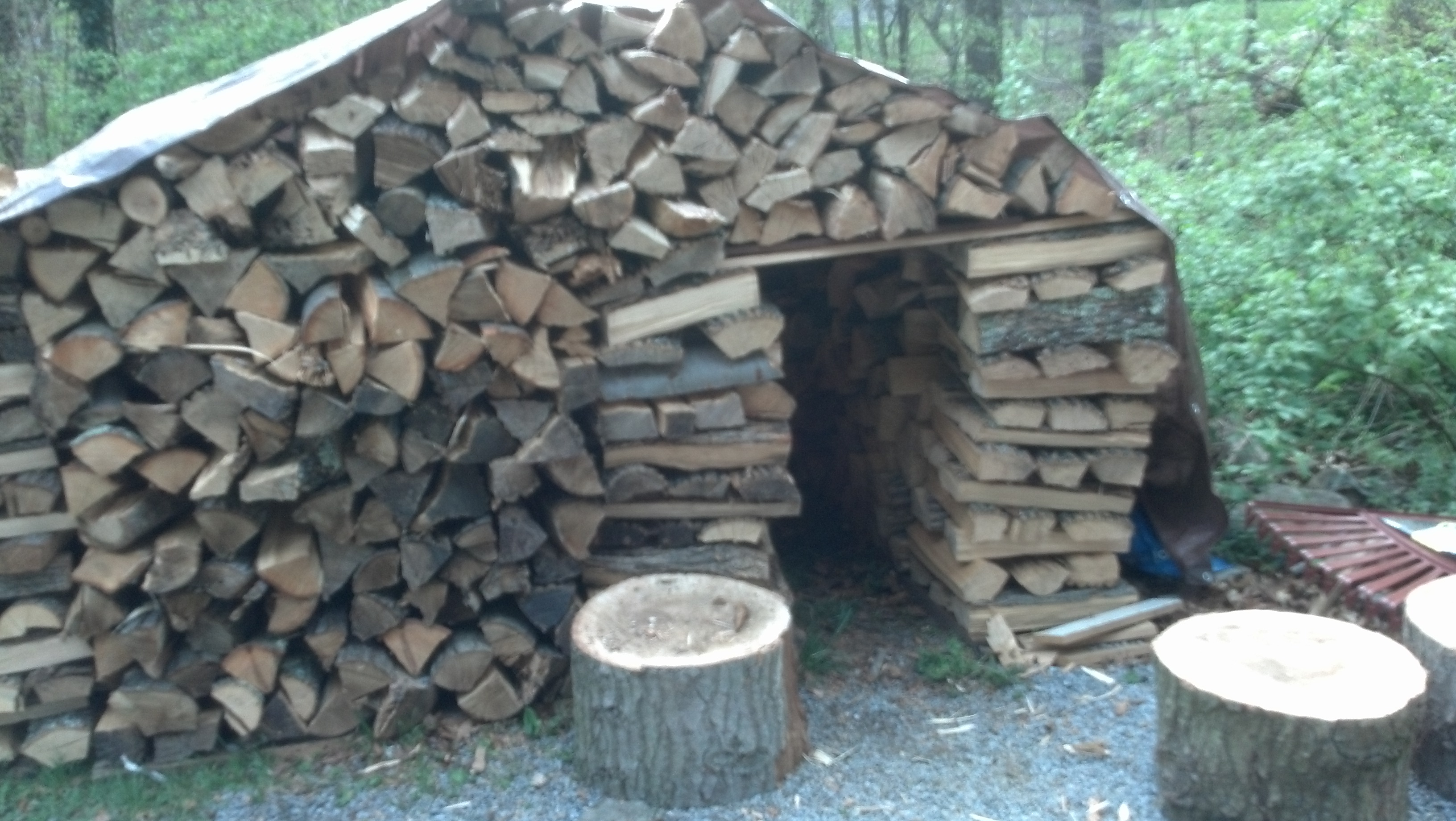 This is the finished house, my latest one in Stamford. I draped a nice brown plastic tarp over it for a roof but have not yet tied it on. I will do that next weekend it rained on Sunday so I did not doing splitting on Sunday. I finished off building the house and put the tarp on on Saturday, the 21st.