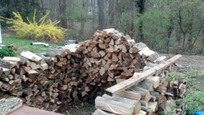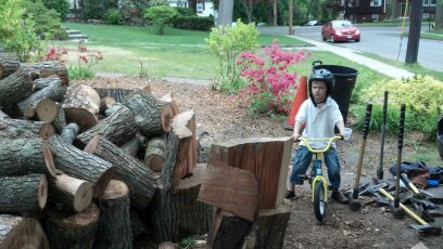 Well, I will do it, even if it takes me all summer and into next fall. There’s not enough room to build a wood house, although the neighborhood is swarming with little children who would love to have the huge edifice that could be built with all this wood. However, several neighbors have strolled by and indicated a willingness to take some of the wood, which is good because there is no place to pile it. The homeowner can take about a cord, but the other 14 to 18 cords will have to be parceled out among the neighbors and I may be reduced to putting it on the curb to be taken by strangers. If the neighbors become saturated with firewood then, with the homeowners permission, I may put the address on this blog and any followers can come by and grab some.