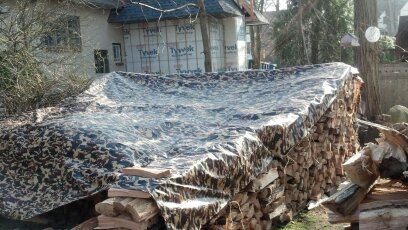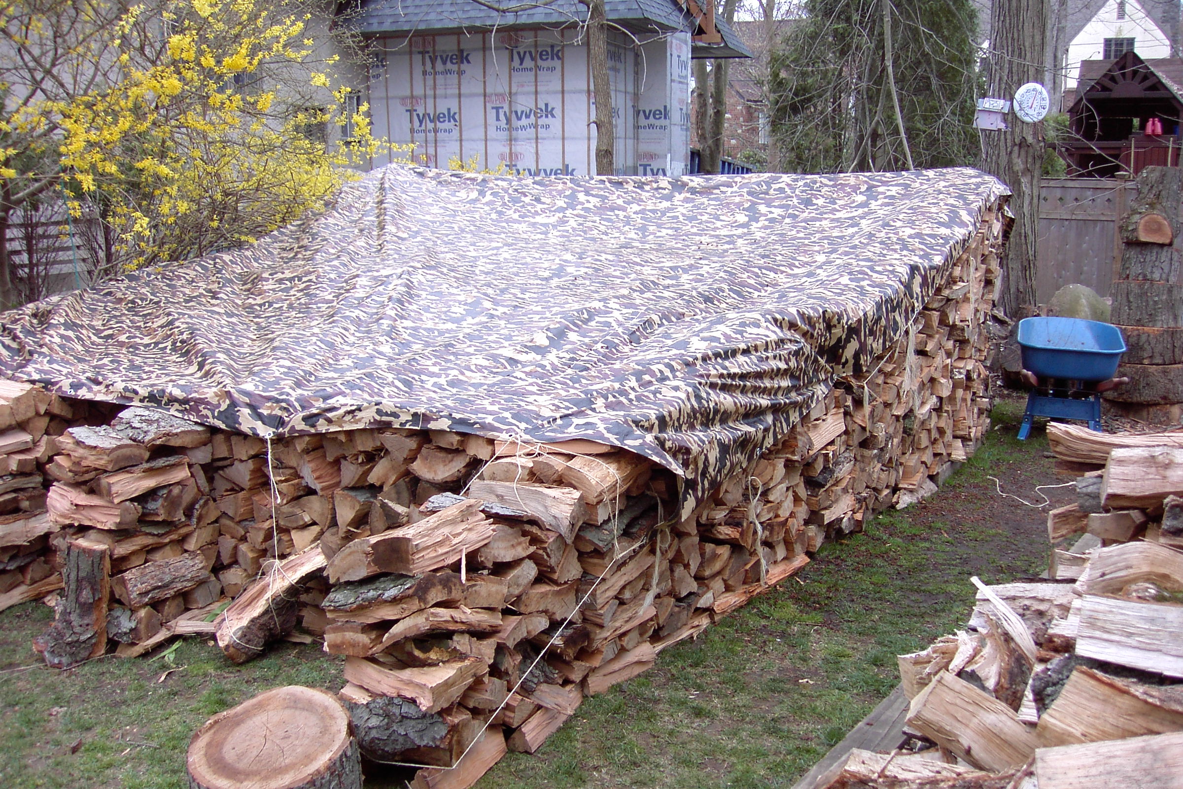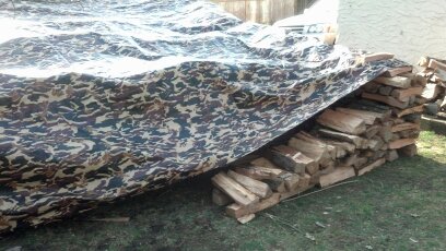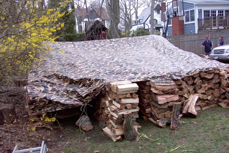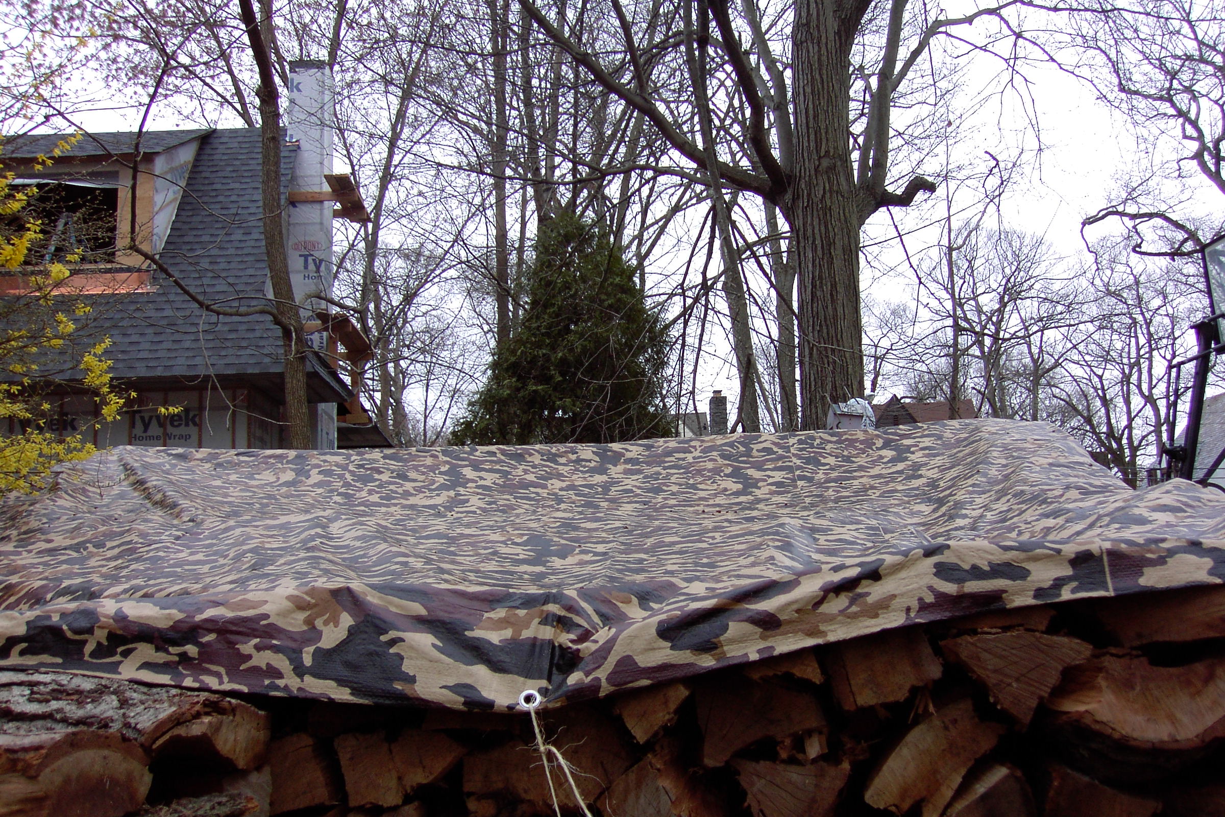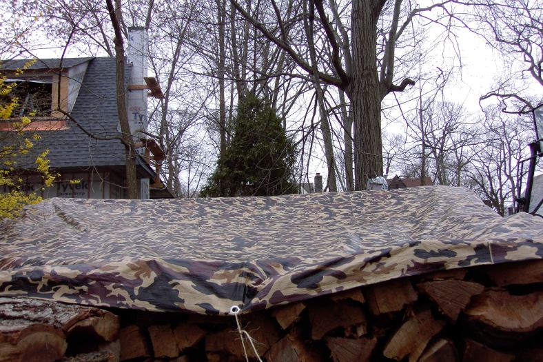 Just about finished now. We put on the tarp roof, because I got it from Northern Tools where I ordered it from. It is  16 x 20′ ,just big enough to cover the house. (And my favorite camo design. Notice how it blends in with the background, virtually concealing the wood pile.) The house isn’t quite finished yet, but I wanted to fit it on. We tied it down on one side where the house is finished, on the right, but not yet on the left, because I’m still