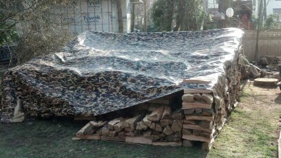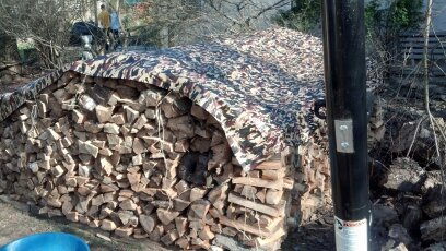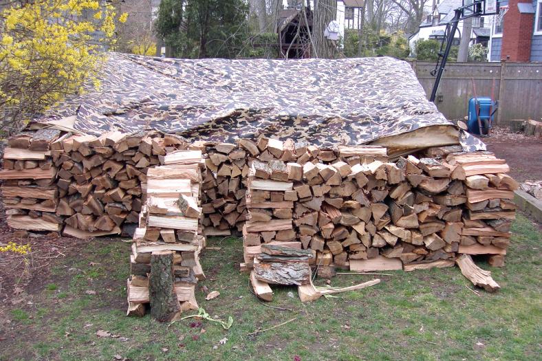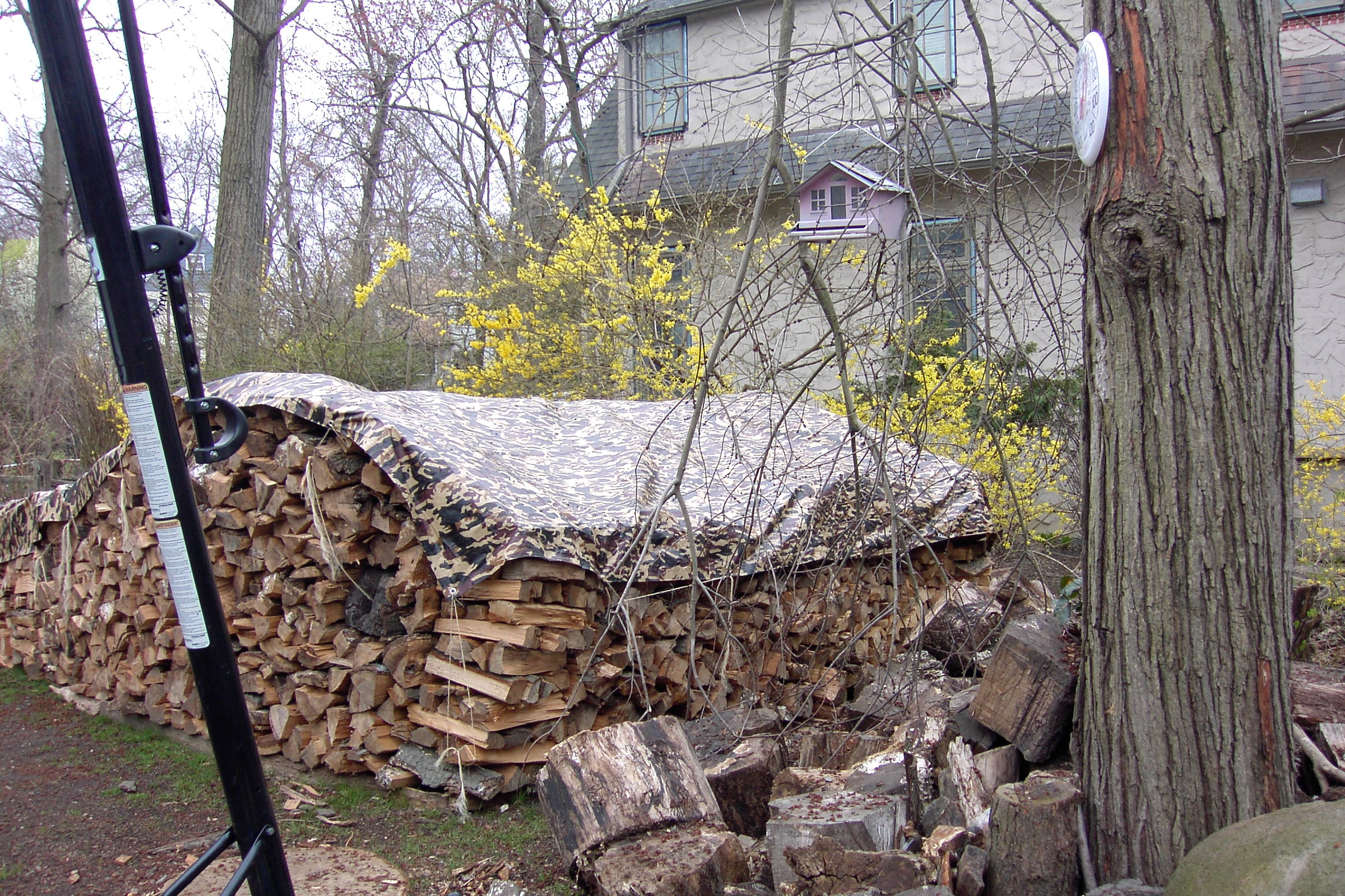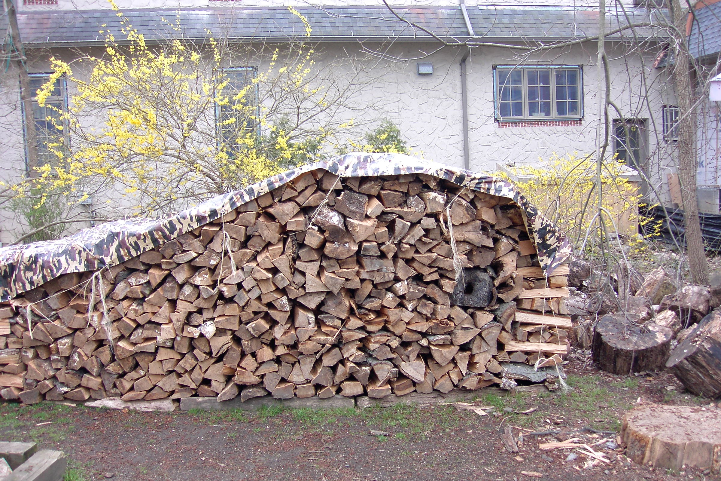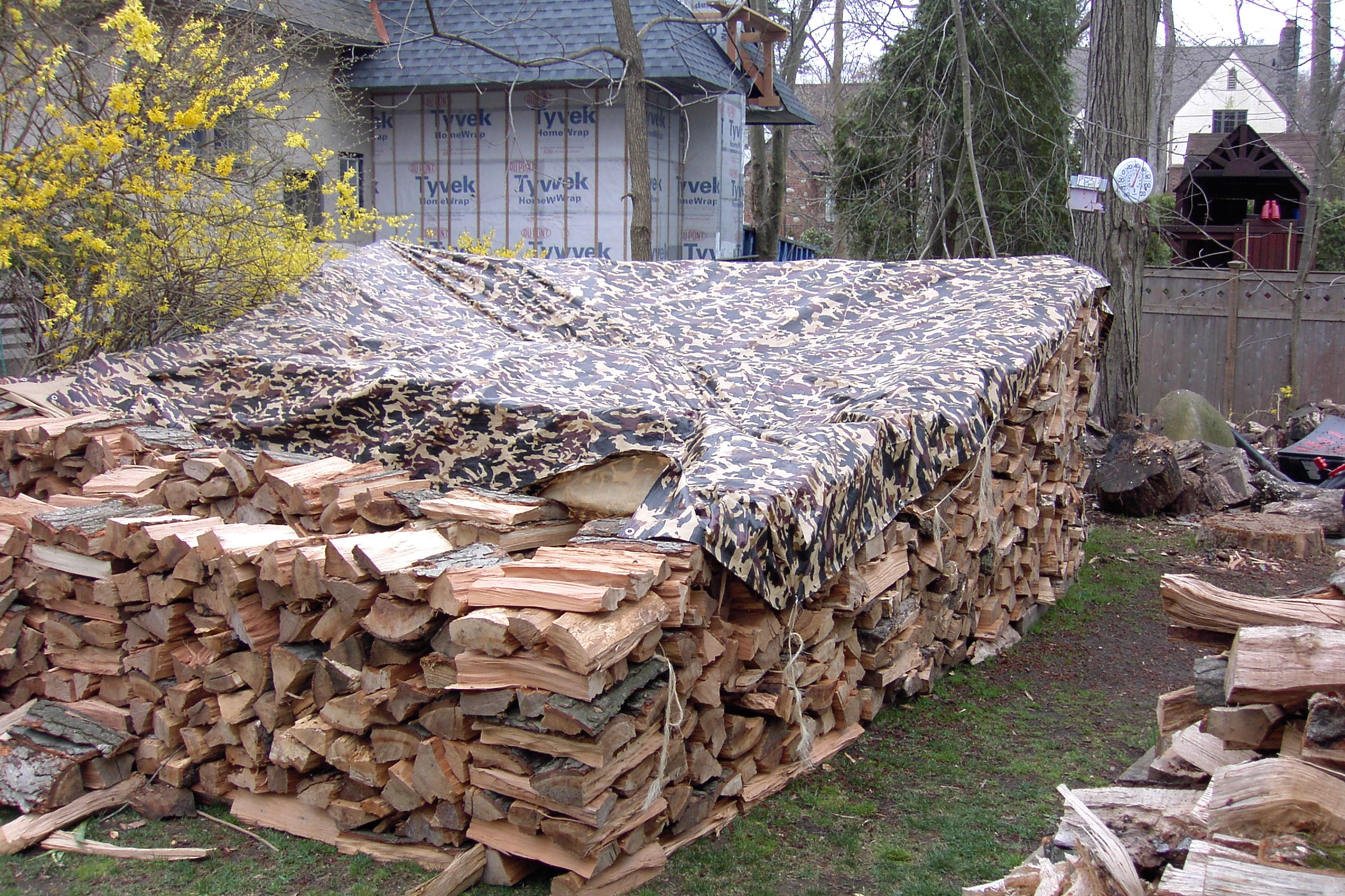 Just about finished now. We put on the tarp roof, because I got it from Northern Tools where I ordered it from. It is  16 x 20′ ,just big enough to cover the house. (And my favorite camo design. Notice how it blends in with the background, virtually concealing the wood pile.) The house isn’t quite finished yet, but I wanted to fit it on. We tied it down on one side where the house is finished, on the right, but not yet on the left, because I’m still