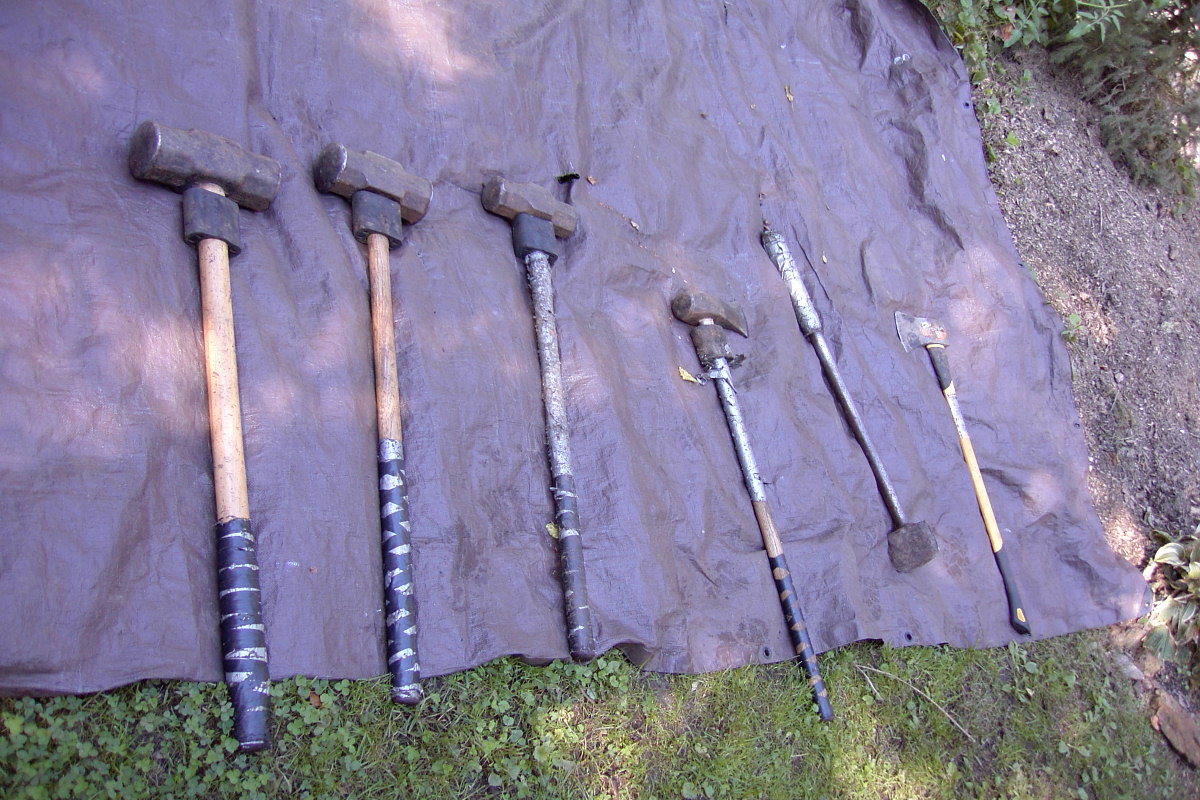 Notice that the handles of the sledgehammers and the mauls are wrapped with tape. This is done to give a better grip and, in the case of the monster maul which has a solid steel handle ,to give me a little cushioning when it slams into a big log.